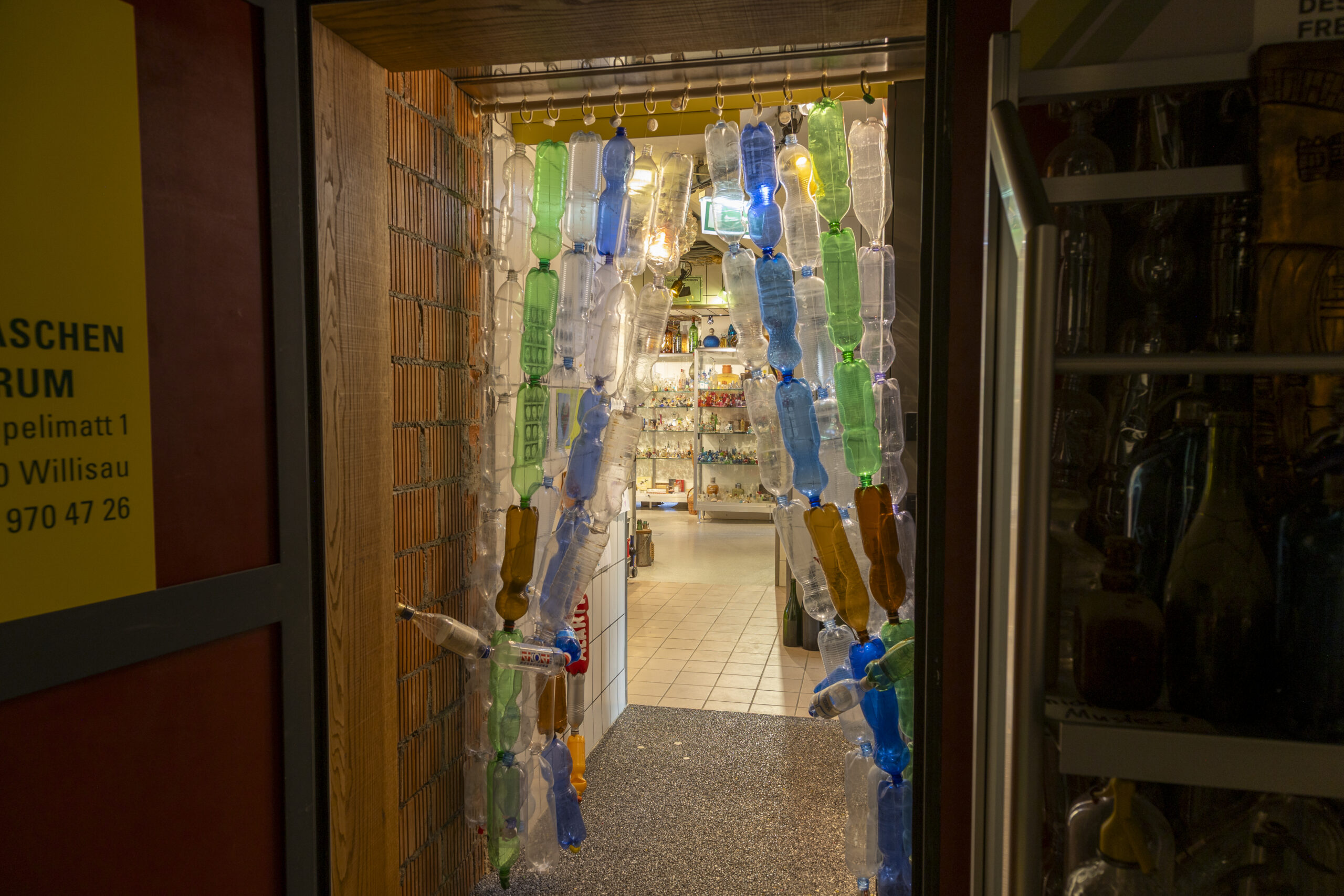 Selbst der Vorhang ist aus Flaschen – und das Geld liegt auf dem Boden.